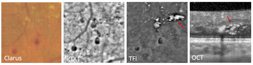 Tous les exsudats durs apparaissaient en AO-FIO comme des agrégats d’unités élémentaires de 15–25 µm. En OCT, ces micro-exsudats correspondent aux hyperreflective foci observés principalement dans la rétine externe, à proximité des logettes de fluide et s’accumulent préférentiellement le long des capillaires et des Telcaps. La modalité TFI permet d’observer ces micro-exsudats avec des meilleurs contrastes, ceux-ci apparaissant très blancs et avec une meilleure profondeur de champ que le RTX1. Le TFI permet donc de mieux suivre l’apparition et l’évolution de ces micro-exsudats dans de futures études longitudinales.